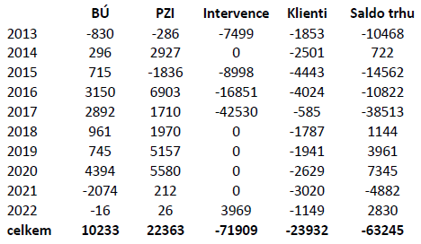 Minus 71,9 miliard euro je saldo intervencí ČNB na trhu. ČNB dále stáhla z trhu 23,9 miliard euro od svých klientů, celkem tedy nakoupila 95,8 miliardy euro – to je téměř trojnásobek toho, co vytvořila ekonomika.